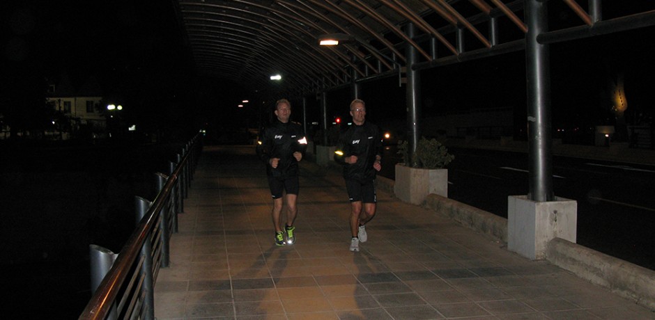 Santiago viste sig at være turens værste løb, hvor før halvvejs måtte ned og bide i græsset. Vi havde fået en kop kaffe og en pose peanuts i flyet fra Falklandsøerne som forberedelse til natteløbet i Santiago.